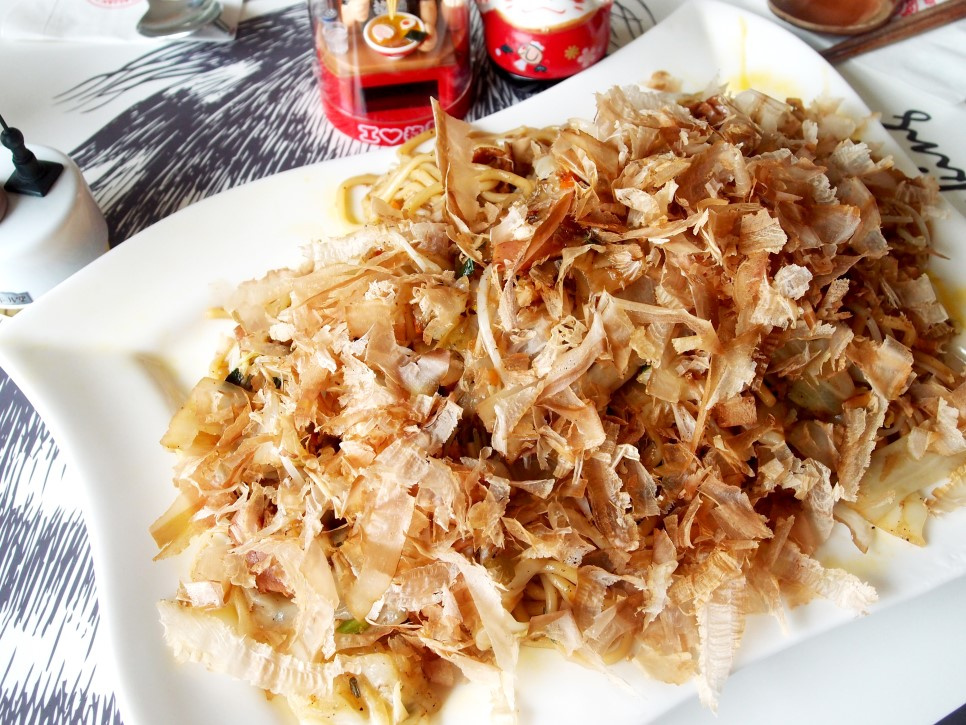 완성된 야끼소바를 먹음직스러운 그릇에 옮겨 담습니다. 그 위에 가쓰오부시를 풍성하게 솔솔 뿌려주세요. 따뜻한 야끼소바의 열기에 가쓰오부시가 춤추듯 움직이며 먹음직스러운 풍미를 더할 거예요.