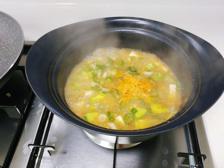 부드러운 식감의 두부 1/2모를 먹기 좋은 크기로 썰어 넣고, 보기에도 좋고 맛도 살려주는 고춧가루 1작은술을 살짝 뿌려 넣어주세요. 이 과정이 된장찌개의 풍미를 한층 더 끌어올려 준답니다.