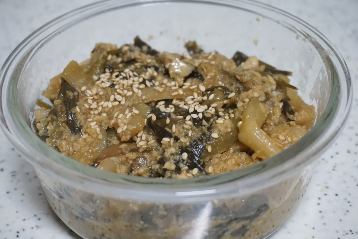 마지막으로, 완성된 묵은지 볶음에 고소한 참기름 1큰술과 통깨 2큰술을 솔솔 뿌려주면, 김수미 선생님의 레시피를 응용한 특별하고 맛있는 묵은지 볶음이 완성됩니다! 따뜻한 밥과 함께 맛있게 즐겨보세요.