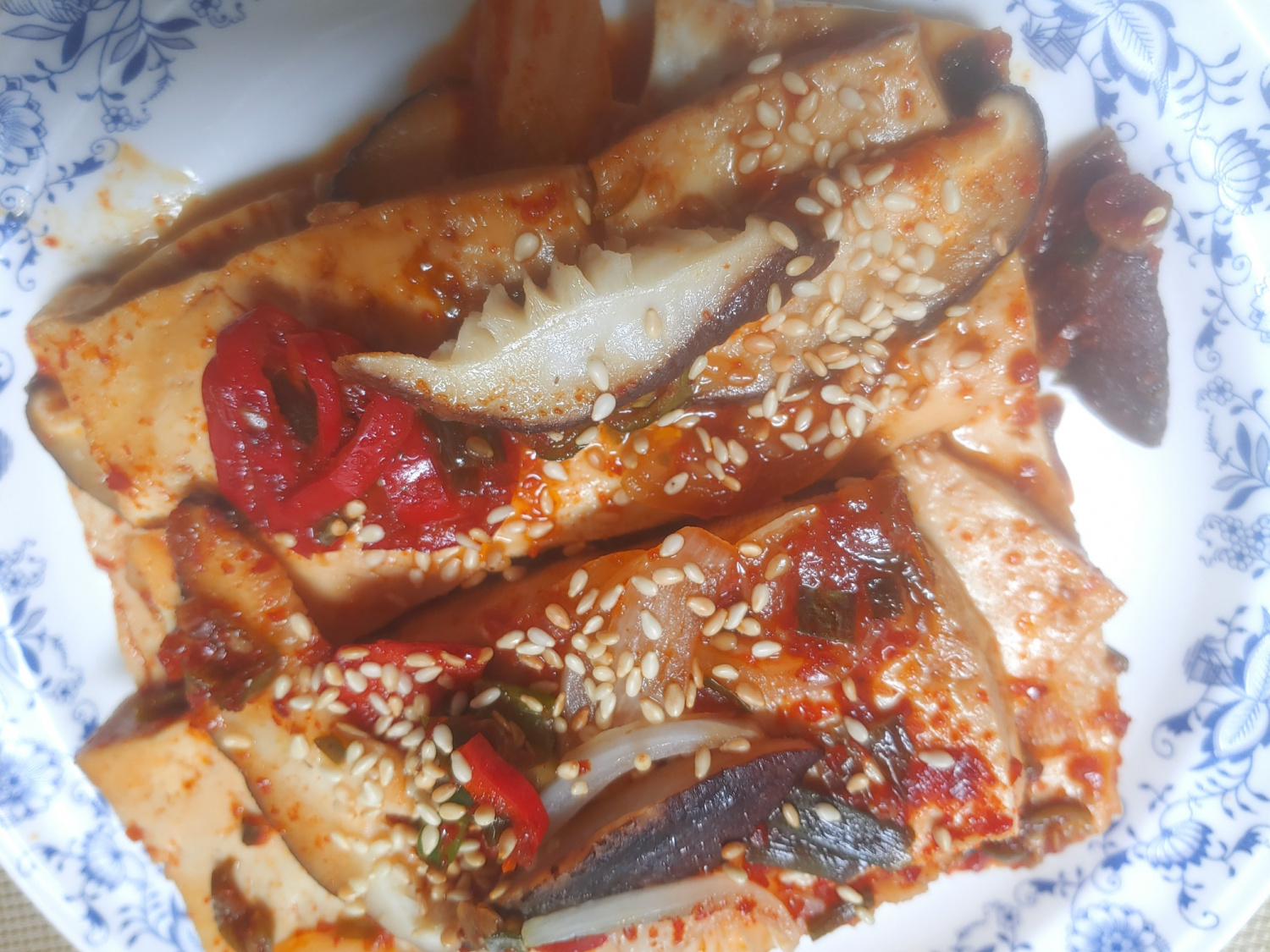 마지막으로 통깨를 솔솔 뿌려주면 매콤하면서도 짭조름한 버섯두부조림 완성입니다! 따끈한 밥과 함께 드시면 정말 맛있어요.