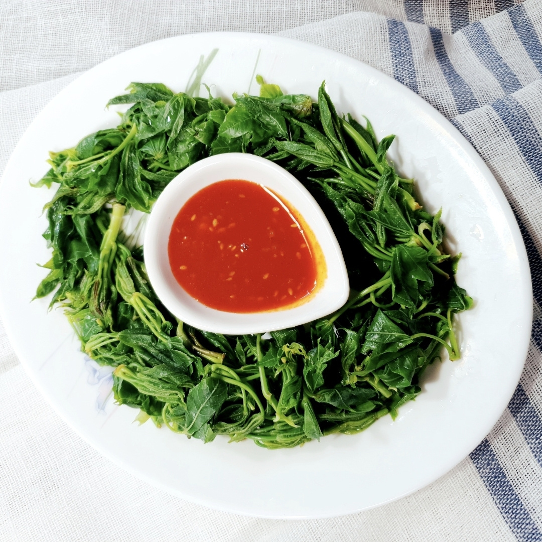 이제 보기 좋게 담아낼 차례입니다. 넓은 접시나 그릇의 가운데에 먹음직스럽게 만든 초고추장을 보기 좋게 담아주세요. 그 초고추장을 중심으로, 물기를 제거한 엄나무순 숙회를 빙 둘러 예쁘게 플레이팅하면 완성입니다! 자연의 맛과 봄의 향기를 즐길 준비가 되셨나요?
