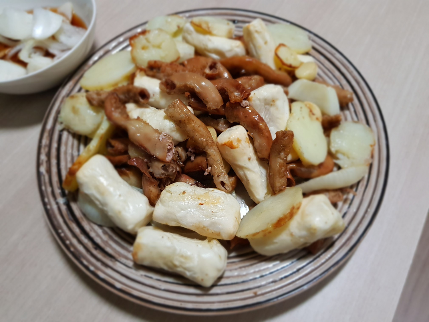 먼저 곱창은 흐르는 물에 깨끗하게 헹궈주세요. 양파는 껍질을 벗기고 큼직하게 썰고, 감자도 껍질을 벗기거나 깨끗하게 씻어 먹기 좋은 크기(약 2cm 두께)로 썰어줍니다. 통마늘은 껍질을 벗겨 준비해주세요. 밀떡은 찬물에 헹궈 준비합니다. 모든 재료를 손질하여 조리할 준비를 마칩니다.