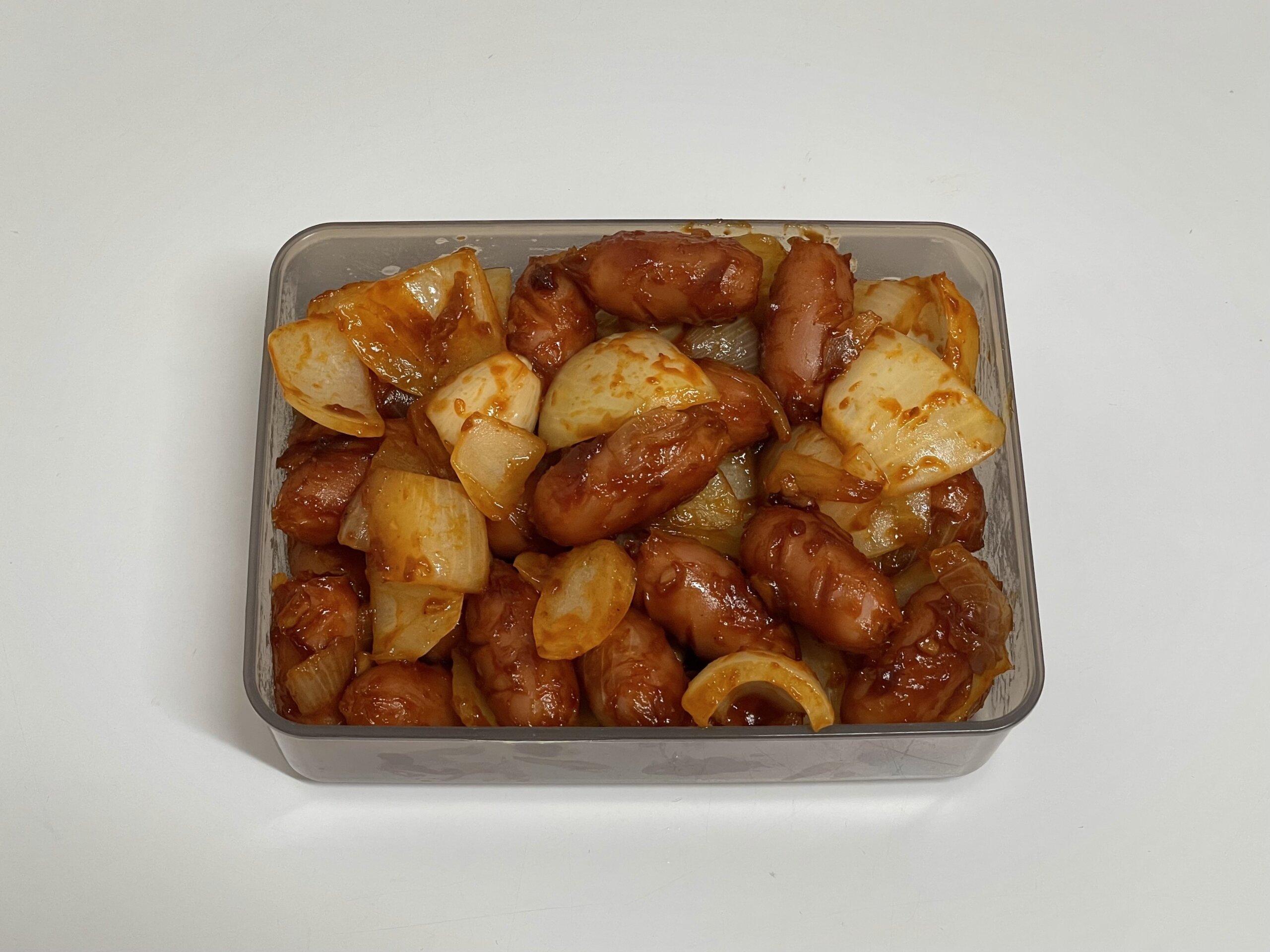 먼저 주재료인 양파는 껍질을 벗기고 깨끗하게 씻은 후, 먹기 좋은 크기(약 1cm 두께의 채썰기 또는 깍둑썰기)로 썰어 준비해 주세요. 소시지도 마찬가지로 한 입 크기로 썰어주시면 좋습니다. (예: 비엔나 소시지는 반으로 가르거나 모양대로 썰기)