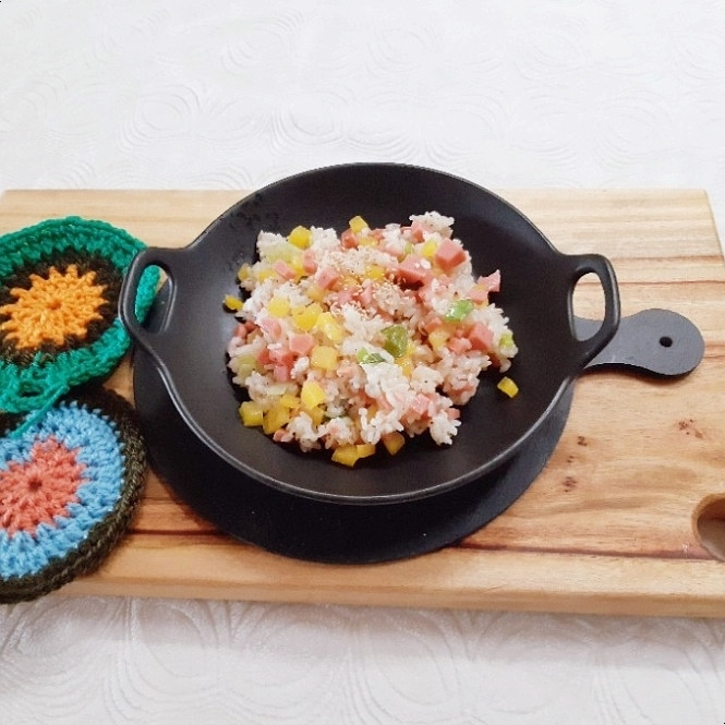 짜잔! 이제 옛날 소시지의 추억과 단무지의 상큼함이 절묘하게 어우러진, 누구나 좋아하는 맛있는 소시지 단무지 볶음밥이 완성되었습니다! 간단하지만 맛은 보장하는 이 볶음밥으로 든든한 한 끼 식사를 즐겨보세요.