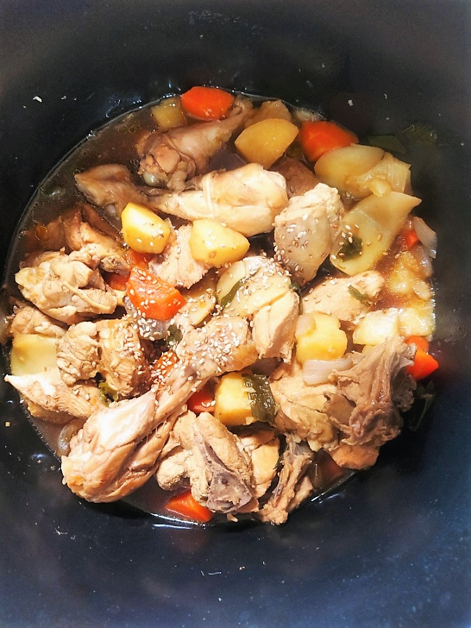 이제 본격적으로 끓일 시간입니다. 냄비에 초벌로 데친 닭과 미리 썰어둔 감자, 당근, 양파를 모두 넣습니다. 그리고 만들어둔 간장 양념장을 골고루 부어주세요. 불은 중불과 약불 사이에서 은근하게 끓여줍니다.