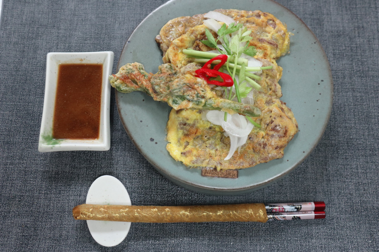 함께 곁들일 야채를 준비합니다. 보통 양파나 부추를 얇게 썰어 곁들이는데, 이 레시피에서는 부추 대신 향긋한 미나리를 사용했습니다. 쪽파를 얇게 썰어 함께 곁들여도 좋습니다. 신선한 야채는 육전의 풍미를 더해주고 느끼함을 잡아줍니다.