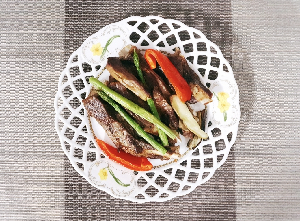오븐 예열을 250도로 맞춥니다. 오븐 팬에 양념한 양갈비와 준비한 아스파라거스, 가지, 피망을 보기 좋게 올립니다. 250도로 예열된 오븐에 넣고 약 20분간 구워줍니다. 중간에 한번 뒤집어주면 더욱 고르게 익힐 수 있습니다. 오븐 사양에 따라 시간은 조절해주세요.