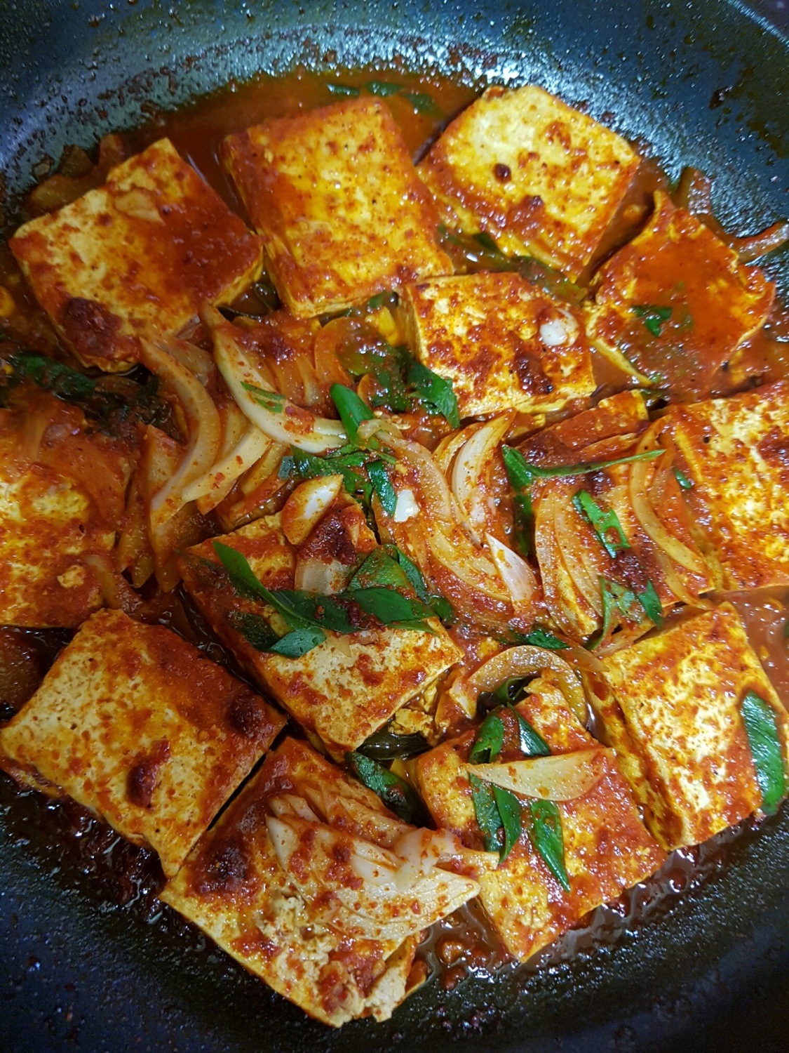 양파는 채 썰고, 대파는 어슷 썰어 준비합니다. 볶음용 프라이팬이나 냄비에 구워둔 두부를 깔고, 그 위에 채 썬 양파와 어슷 썬 대파를 보기 좋게 올립니다. 준비해둔 양념장을 두부와 채소 위에 골고루 뿌려줍니다. 너무 졸아드는 것을 방지하기 위해 물은 1/4컵(약 50ml) 정도만 넣어주세요.