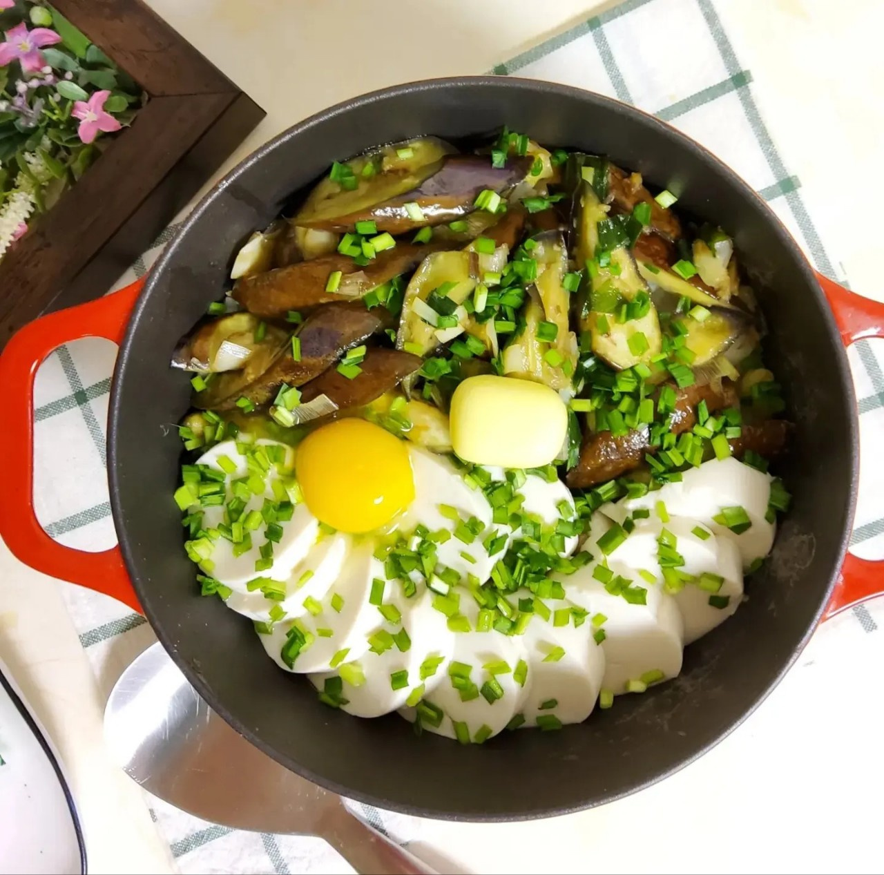 밥과 가지, 순두부가 뜸을 들이는 동안, 밥 위에 올릴 준비를 합니다. 밥에 열기가 오르고 뜸이 어느 정도 들었을 때, 따뜻한 밥 위에 버터 한 조각과 달걀 노른자를 올려주면 더욱 고소하고 풍부한 맛을 즐길 수 있습니다. (버터와 노른자는 선택 사항입니다.)