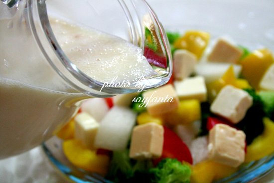완성된 샐러드 위에 방금 만들어 둔 상큼한 백도-자두 드레싱을 먹기 직전에 골고루 뿌려주세요. 바로 드시면 과일의 신선함과 채소의 아삭함, 그리고 드레싱의 새콤달콤함이 입안 가득 퍼지면서 최고의 맛을 즐기실 수 있습니다.