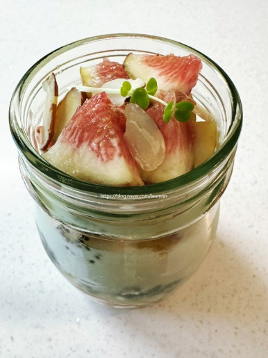 준비한 유리병이나 예쁜 그릇을 꺼내, 먹기 좋게 자른 무화과를 보기 좋게 담아주세요. 유리병에 담으면 층층이 쌓이는 모습이 더욱 먹음직스러워 보입니다.