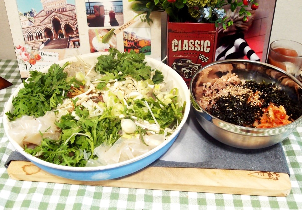 불린 당면과 신선한 쑥갓을 버섯 위에 보기 좋게 올려줍니다. 당면은 국물을 흡수하여 더욱 맛있어지고, 쑥갓은 향긋한 풍미를 더해줍니다.