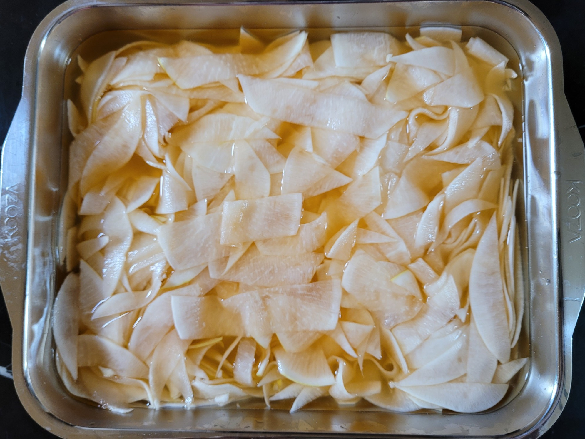 따뜻하게 데워진 단촛물을 미리 손질해 둔 무 슬라이스 위에 골고루 부어주세요. 뜨거운 단촛물이 무에 스며들면서 아삭한 식감을 살려주고 맛을 더해줍니다.