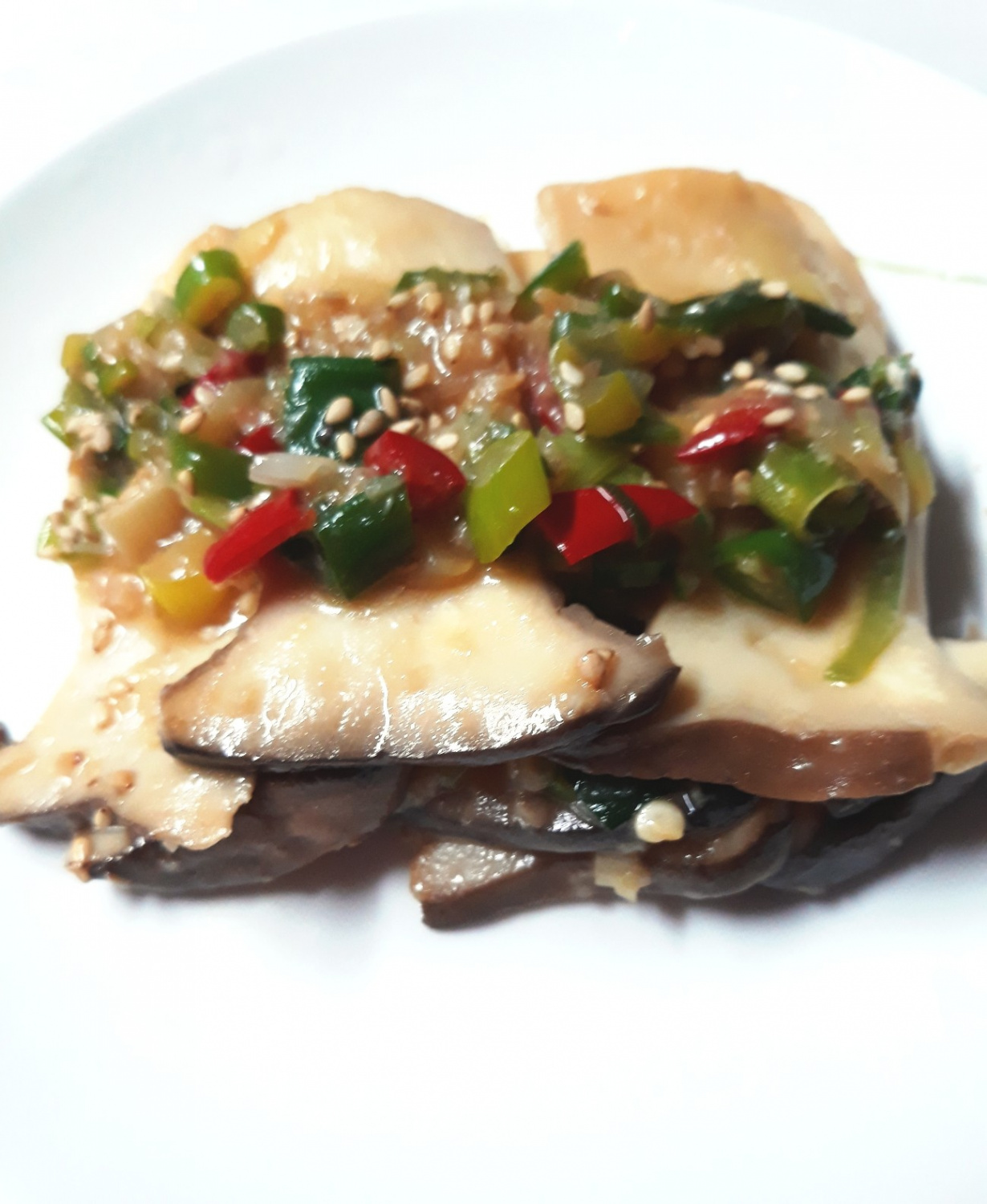 버섯 밑면이 노릇하게 익었으면, 썰어둔 홍고추, 청양고추, 대파를 모두 넣고 버섯과 함께 재빨리 볶아주세요. 채소의 아삭한 식감과 신선한 향이 더해져 더욱 먹음직스러워질 거예요.