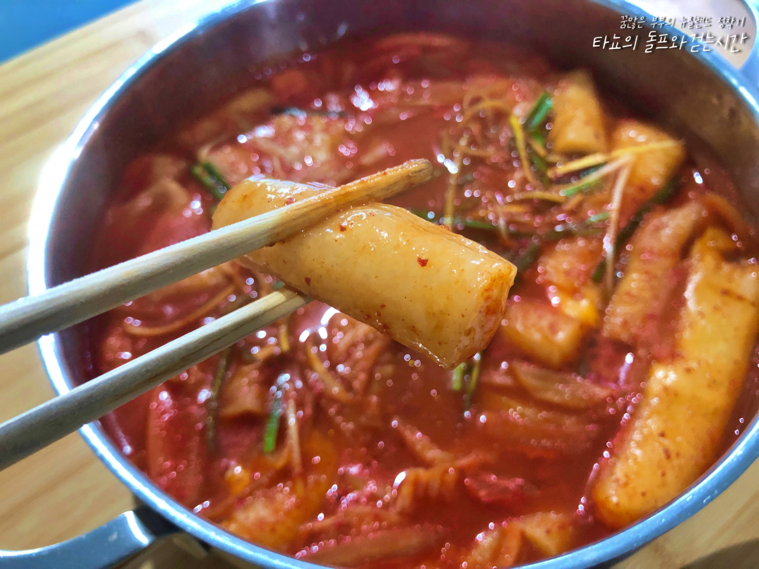 떡볶이 국물이 자작하게 졸아들고 떡이 어느 정도 익었을 때, 마지막으로 치즈떡을 넣어줍니다. 라이스페이퍼 1겹으로 만든 치즈떡은 모양이 약해 보일 수 있으니, 이때 넣어주는 것이 좋습니다.