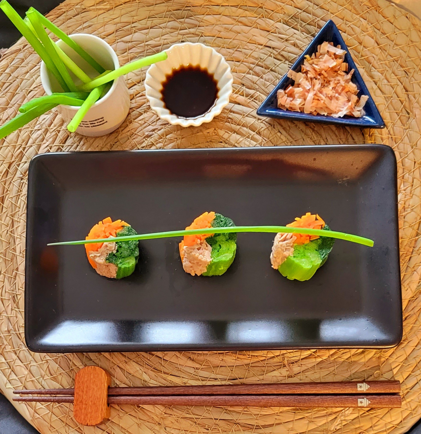 마지막으로 준비한 실파를 송송 썰어 위에 장식해주면 완성입니다. 입맛을 돋우는 가쓰오부시와 폰즈 소스를 곁들여 맛있는 참치 소송채 오히다시를 즐겨보세요! 차갑게 식혀 먹으면 더욱 깔끔하고 산뜻한 맛을 느낄 수 있어 여름철 별미로도 좋습니다.