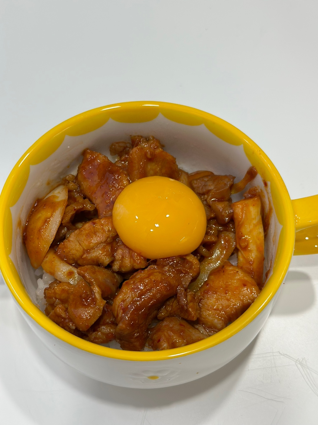 준비된 밥 위에 맛깔스럽게 볶아진 삼겹살 양념을 푸짐하게 올리고, 가운데에 신선한 계란 노른자 2개를 조심스럽게 올려주세요. 노른자를 톡 터뜨려 밥과 고기에 비벼 먹으면 정말 꿀맛이랍니다! 취향에 따라 김가루나 쪽파를 곁들여도 맛있습니다. 맛있게 드세요!