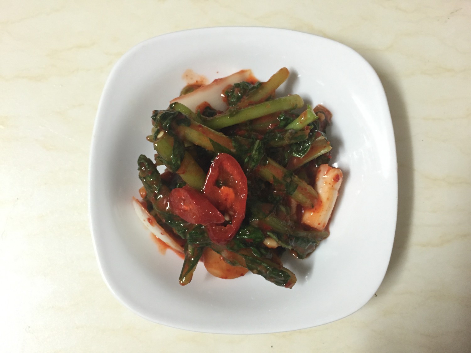 넓은 볼에 물기 뺀 열무, 채 썬 양파, 어슷 썬 대파와 홍고추, 그리고 만들어둔 양념을 모두 넣습니다. 위생장갑을 끼고 양념이 열무에 골고루 묻도록 살살 버무려주세요. 너무 세게 주무르면 열무가 풋내가 날 수 있으니 주의하세요. 자, 이렇게 맛있는 열무김치가 완성되었습니다!