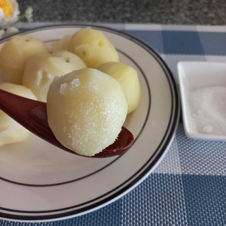 4. 잘 삶아진 따뜻한 감자를 꺼내옵니다. 취향에 따라 달콤한 설탕을 콕 찍어 드셔보세요. 포근하고 부드러운 감자와 설탕의 달콤함이 어우러져 최고의 간식이 완성됩니다. 간편하지만 영양도 풍부한 삶은 감자를 맛있게 즐기세요!