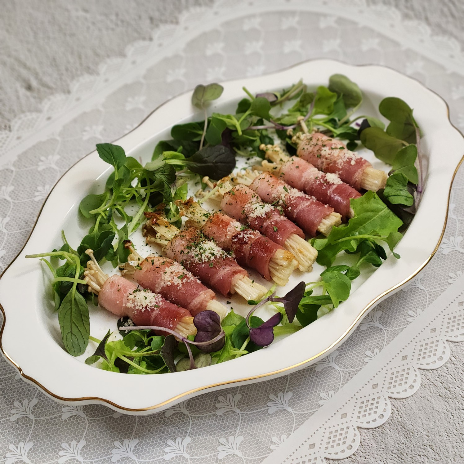 따뜻하게 구워진 팽이버섯 베이컨말이를 접시에 보기 좋게 담아주세요. 그 옆에 물기를 제거한 어린잎 채소를 곁들이고, 취향에 따라 파슬리 가루와 파마산 치즈를 솔솔 뿌려주면 완성! 간단하게 만들었지만 맛은 일품인 훌륭한 술안주 겸 밥반찬으로 즐겨보세요.