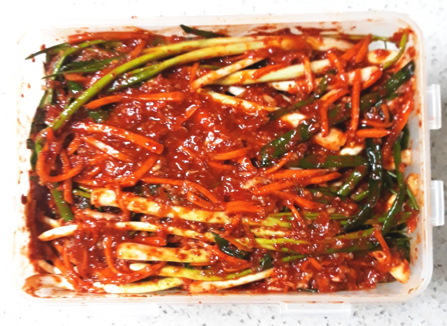 맛있게 버무려진 쪽파김치는 깨끗한 보관 용기에 차곡차곡 담아주세요. 바로 드셔도 맛있지만, 냉장고에서 하루 정도 숙성시키면 맛이 더욱 깊어집니다. 간편하게 만든 쪽파김치로 맛있는 식탁을 즐겨보세요!