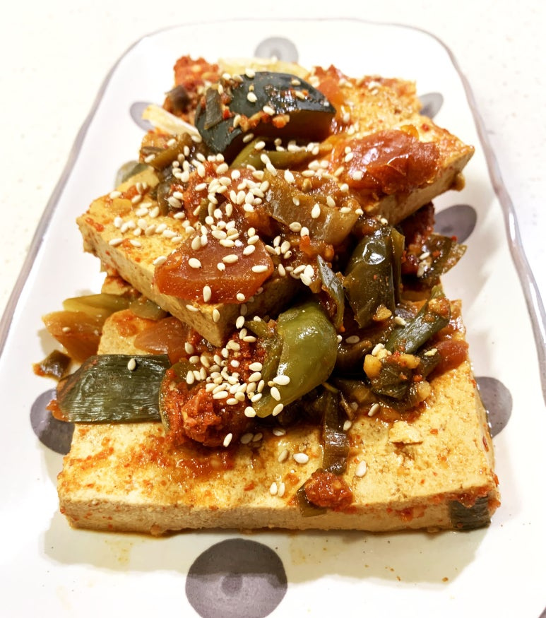 완성된 두부조림은 예쁜 접시에 보기 좋게 담아냅니다. 마지막으로 통깨를 솔솔 뿌려주면 칼칼하면서도 시원하고 깔끔한 맛의 두부조림이 완성됩니다! 단단한 두부라 부서지지 않고 모양이 살아있어 더욱 만족스러운 식사를 즐길 수 있을 거예요. 밥 한 공기 뚝딱 비우게 되는 최고의 밥도둑이랍니다.