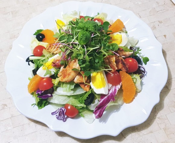 다양한 음식과 환상의 궁합을 자랑하는 근사한 샐러드입니다. 가벼운 식사를 원하실 때, 또는 건강한 다이어트 메뉴로도 손색이 없어요. 삶은 계란, 올리브, 달콤한 고구마까지 곁들이면 든든한 한 끼 식사로도 충분하답니다. 신선한 채소와 촉촉하게 구워진 닭가슴살의 조화, 그리고 부드러운 크림치즈 소스가 입안 가득 행복을 선사할 거예요.