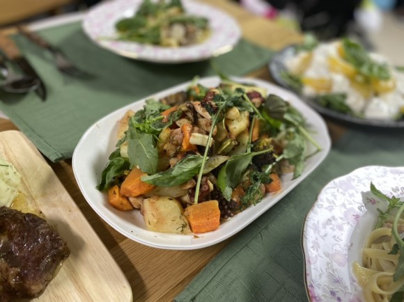 오븐에서 꺼낸 후, 구워지면서 살짝 까맣게 변한 루꼴라는 보기 좋게 건져내고, 먹음직스럽게 구워진 문어와 채소를 예쁜 접시에 옮겨 담습니다.