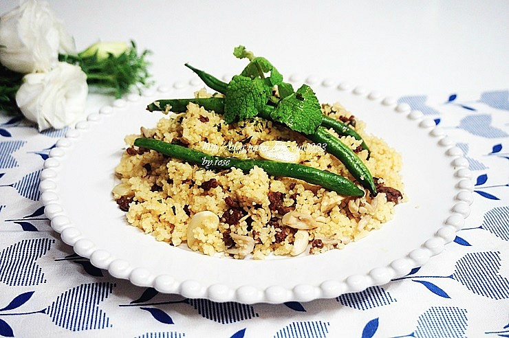 쿠스쿠스가 보슬보슬하게 풀어지면, 앞서 볶아둔 버섯과 밑간한 소고기를 넣고 모든 재료가 잘 섞이도록 가볍게 섞어줍니다. 뚜껑을 덮고 아주 약한 불에서 5분 정도 뜸을 들여줍니다. 소고기에 이미 간장 밑간을 했고 치킨스톡 육수의 맛이 배어들어 있어 별도의 간은 하지 않아도 맛있습니다.
