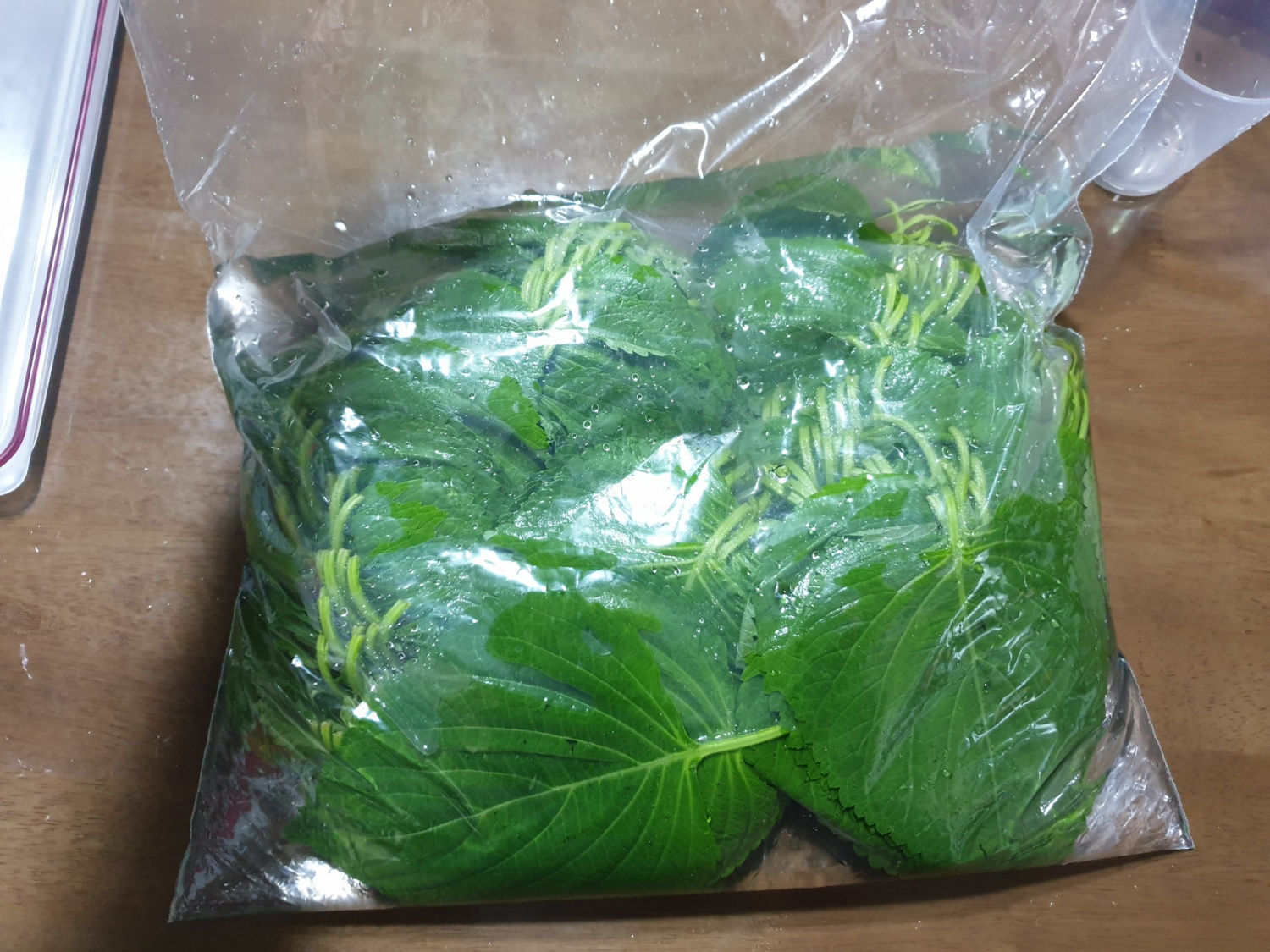 만약 지퍼백 대신 반찬통을 사용하신다면, 깻잎을 넣고 소금물을 부은 뒤 누르미로 꾹 눌러주세요. 깻잎이 뜨지 않도록 하는 것이 중요합니다.