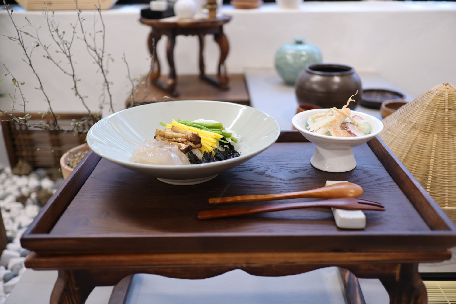 따뜻하게 지은 밥 위에 준비한 미나리, 청포묵, 버섯, 달걀 지단, 김을 예쁘게 얹어주세요. 곁들임으로 준비한 신선하고 향긋한 수삼 냉채까지 함께 올리면 완성입니다! 맛있게 드시고 면역력도 쑥쑥 키우세요!~
