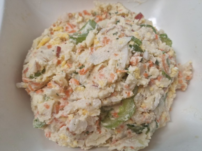 넓은 볼에 준비된 모든 사라다 재료(으깬 감자, 다진 양파, 다진 당근, 물기 짠 오이, 스크램블 에그, 썰어둔 사과)를 담아줍니다. 여기에 직접 만든 비건 마요네즈를 듬뿍 넣어주세요. 풍미를 더하기 위해 파슬리 가루와 바질 가루를 약간 뿌려줍니다. 보기에도 예쁘고 향긋하기까지 하네요!