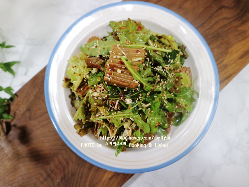 Acorn jelly can be enjoyed simply with a savory dressing, or seasoned with chopped kimchi for a spicy kick. However, incorporating a generous amount of fresh vegetables creates a salad that is both crunchy and refreshing, with a wonderfully soft texture that makes it incredibly satisfying and easy to finish!