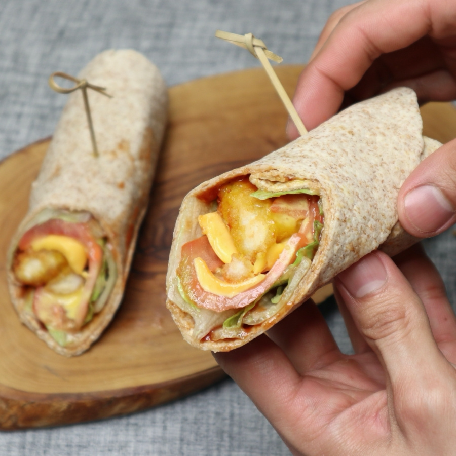 8. To keep everything in place, insert a toothpick or a small sandwich skewer through the wrap, then slice it in half. And there you have it – a delicious chicken snack wrap, perfect for brunch! The combination of crisp lettuce and tomato with the satisfying chicken nuggets is fantastic. The sauces complement each other beautifully, making it a delightful meal for the whole family, and a great option for kids’ snacks too. Enjoy your meal today! 🙂