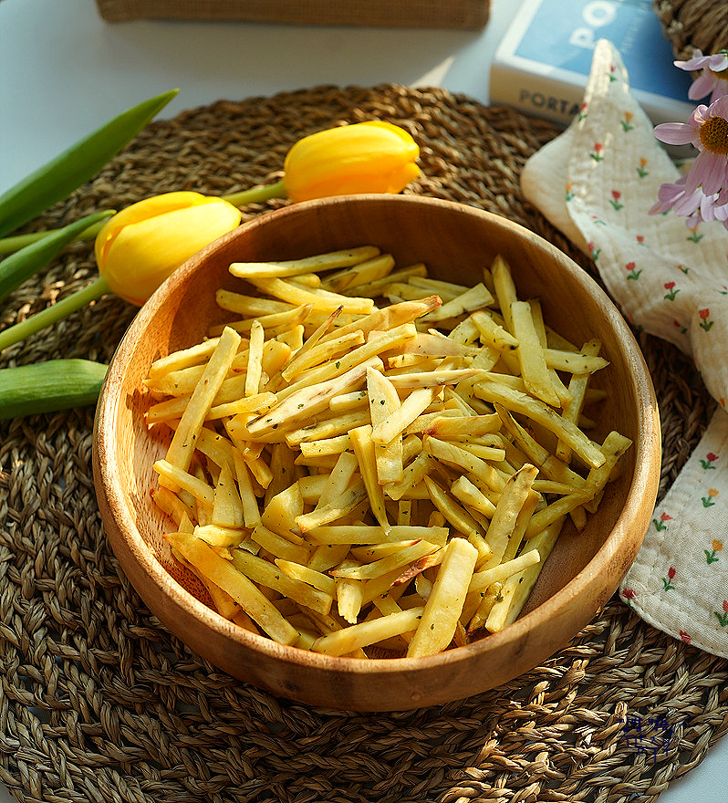 Use paper towels to gently pat and press the sweet potato sticks to absorb any remaining moisture. Thoroughly drying ingredients before air frying not only saves cooking time but also ensures a crispier result. This tip applies to other ingredients as well.