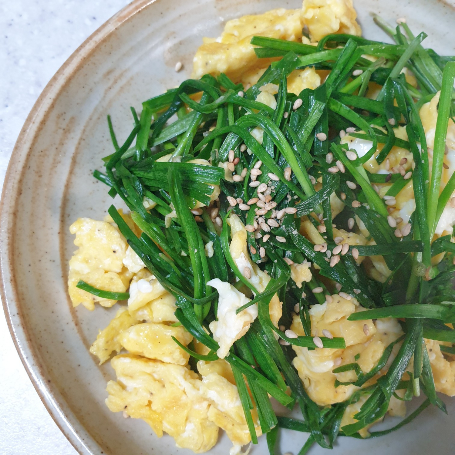 Transfer the delicious chives and egg stir-fry to a serving plate. Sprinkle with toasted sesame seeds for a final touch of flavor and visual appeal.