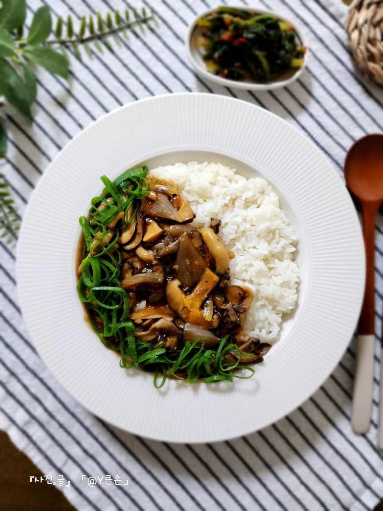 Once the sauce has thickened to your liking, turn off the heat. Sprinkle a pinch of black pepper and gently mix it in. Your delicious Shiitake Mushroom Rice Bowl is ready! Serve a bowl of warm rice, generously top it with the mushroom mixture, and garnish with the chopped green onions. Enjoy your aromatic and hearty meal!