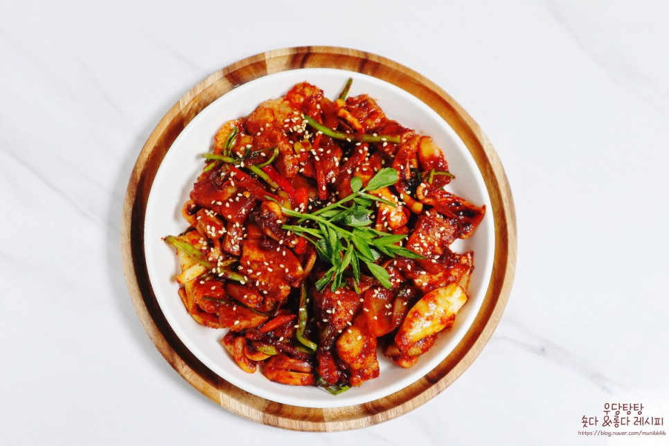 In a large bowl, combine the prepared squid with 2.5 Tbsp soy sauce, 1 Tbsp anchovy sauce, 2.5 Tbsp gochujang, 3 Tbsp gochugaru, 1 Tbsp oligodang, 1.5 Tbsp minced garlic, 1 Tbsp mirin, and a pinch of black pepper. Mix well by hand, ensuring the sauce evenly coats the squid. Let it marinate for a short while to enhance the flavor.