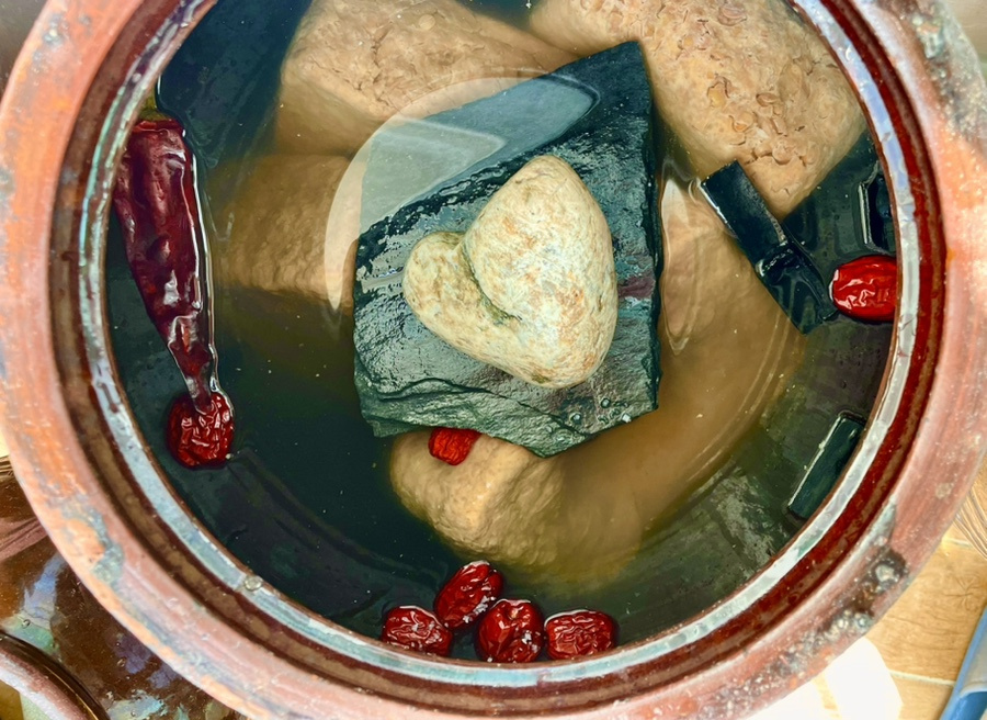 After placing the meju blocks into the jar, it’s essential to keep them submerged in the brine. You can use a bamboo rack or place clean, sterilized heavy stones (like smooth river rocks or decorative stones) on top of the meju to hold them down. This prevents the meju from being exposed to air and spoiling.