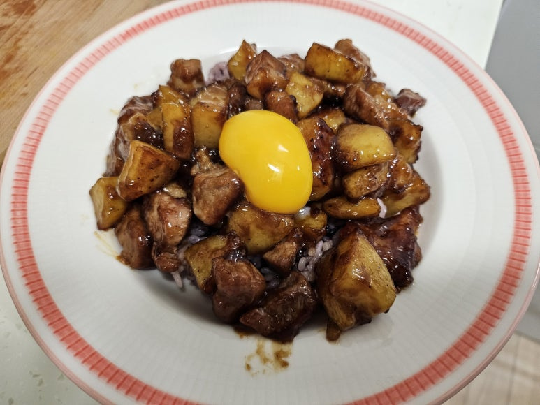 Serve the braised pork and potatoes generously over a bowl of warm rice. Gently place two egg yolks on top. When you break the yolks, they will create a rich, creamy sauce that blends wonderfully with the sweet and savory glaze. This makes for a truly satisfying and delicious rice bowl meal. Perfect for a special occasion or a comforting everyday dish!