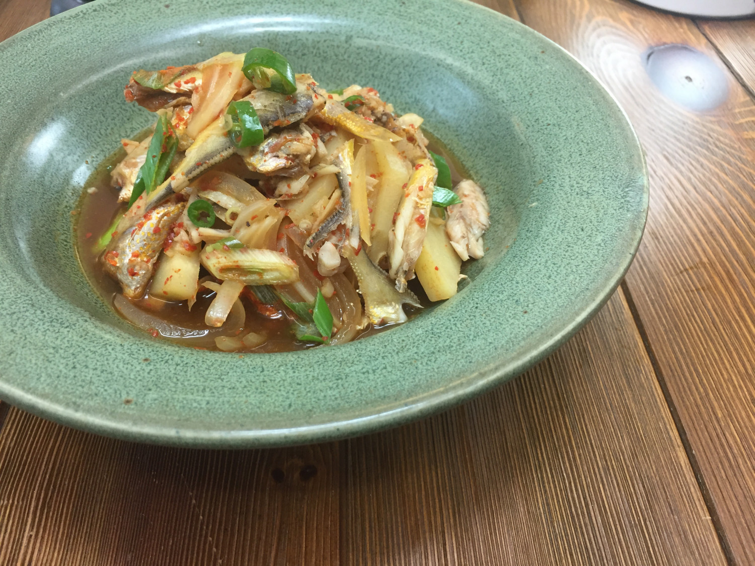 Pour the anchovy-kelp broth (or rice water, or plain water) into a pot. Add the prepared potatoes first and bring to a boil. Once the potatoes are halfway cooked, add the yellow croaker, onions, and the pre-made braising sauce. Simmer over medium-low heat.
