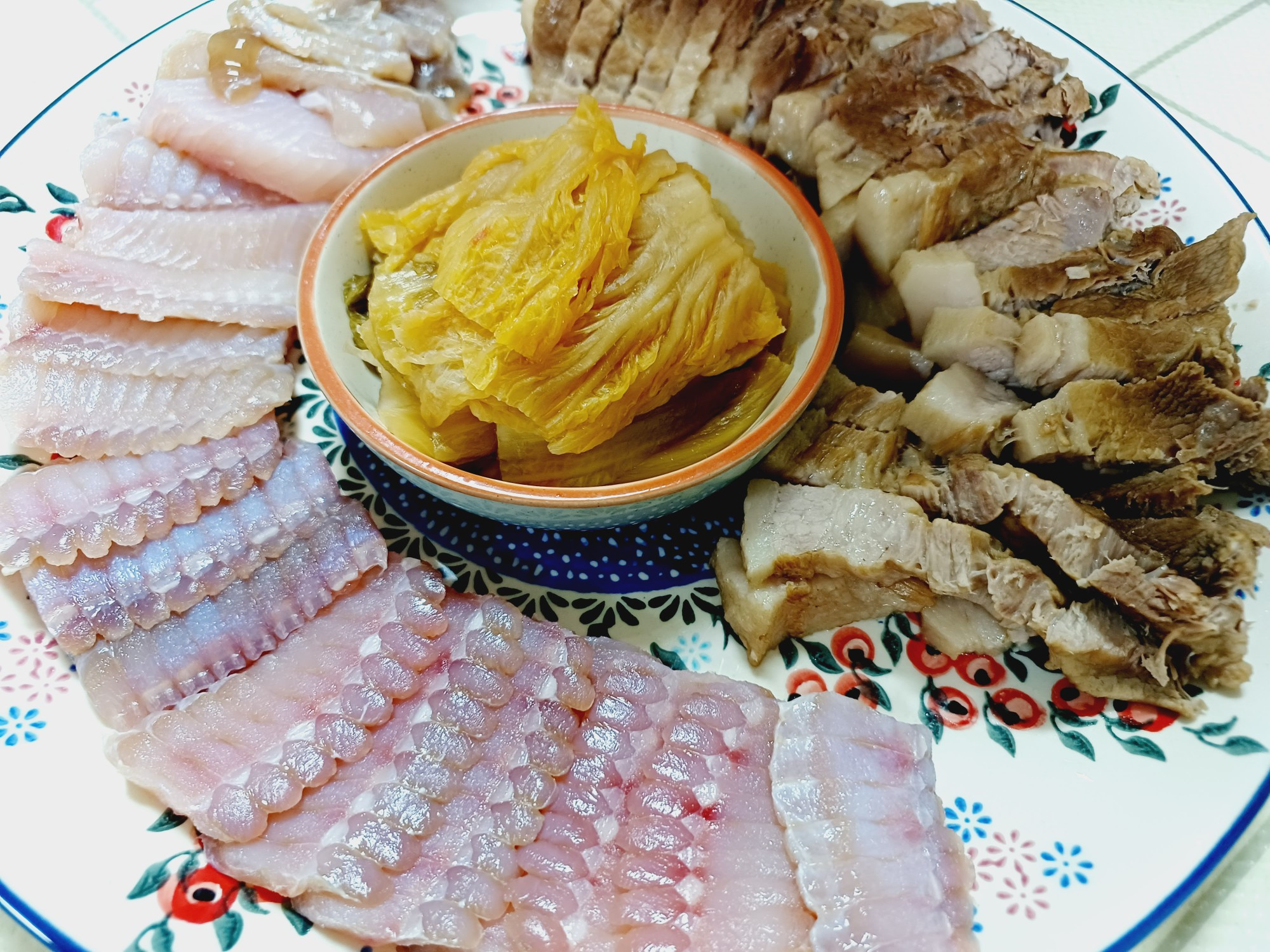 Prepare a serving plate to artfully arrange the hongeo samhap ingredients. First, arrange the sliced boiled pork neatly on one side of the plate. Serving it warm will enhance its deliciousness.