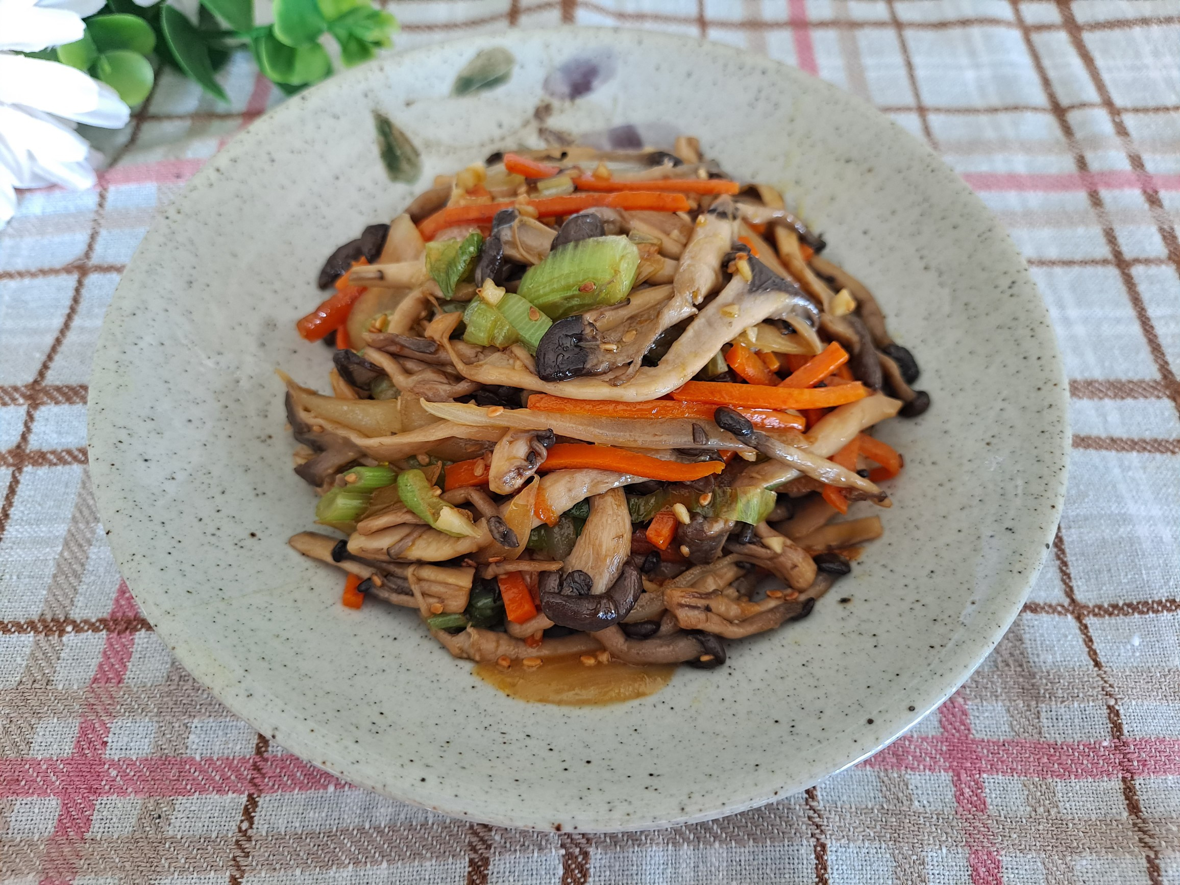 Make a delicious and nutritious oyster mushroom stir-fry, known for being low in calories and rich in dietary fiber, which can help lower cholesterol levels. Its chewy texture and savory flavor make it a perfect side dish for rice or a simple appetizer.