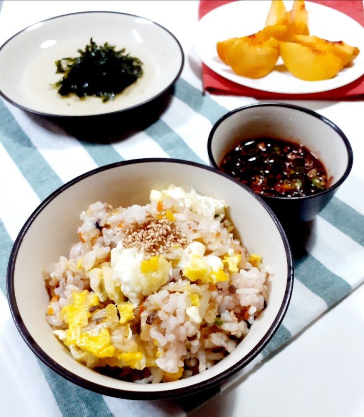 Finally, generously sprinkle the finely chopped seasoned seaweed (gim-garu) over the fried rice. Serve with the prepared soy sauce-based sauce on the side. The seaweed and sauce will further enhance the overall flavor profile of your delicious fried rice.