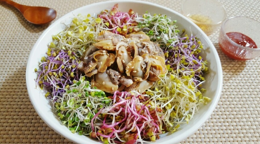 In a serving bowl, place the warm rice. Generously top the rice with the fresh bean sprouts, followed by the prepared clam meat. Sprinkle a pinch of toasted sesame seeds over everything for a finishing touch.