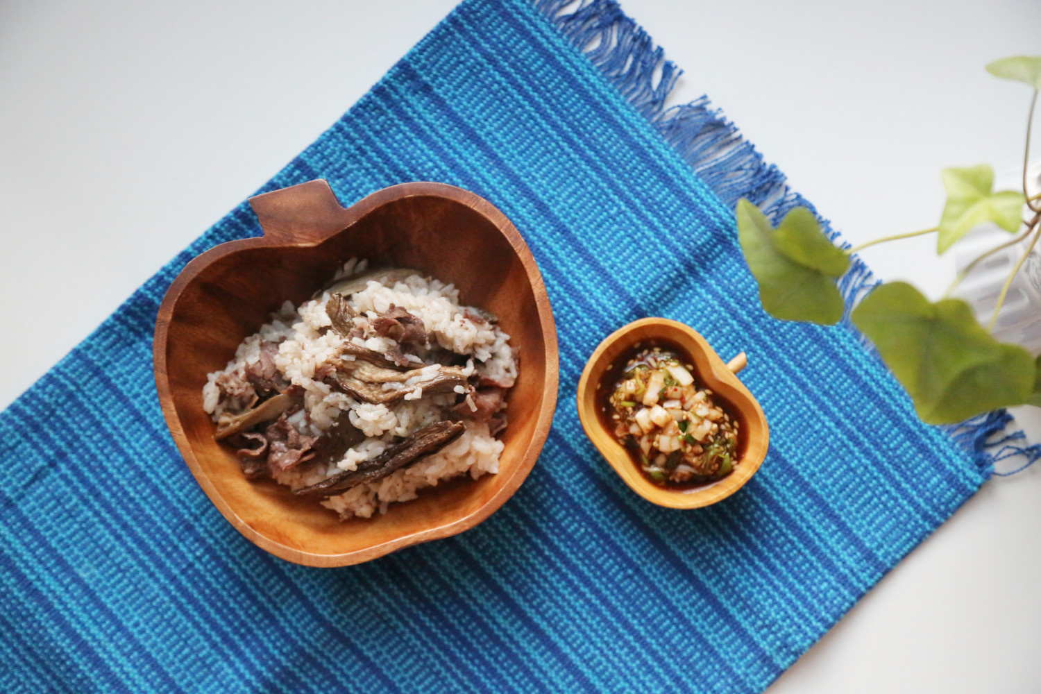 Serve the mixed Gaji-bap in bowls. Accompany it with the prepared soy sauce seasoning. You can pour the seasoning over the rice or mix it in to enjoy the delicious flavors.