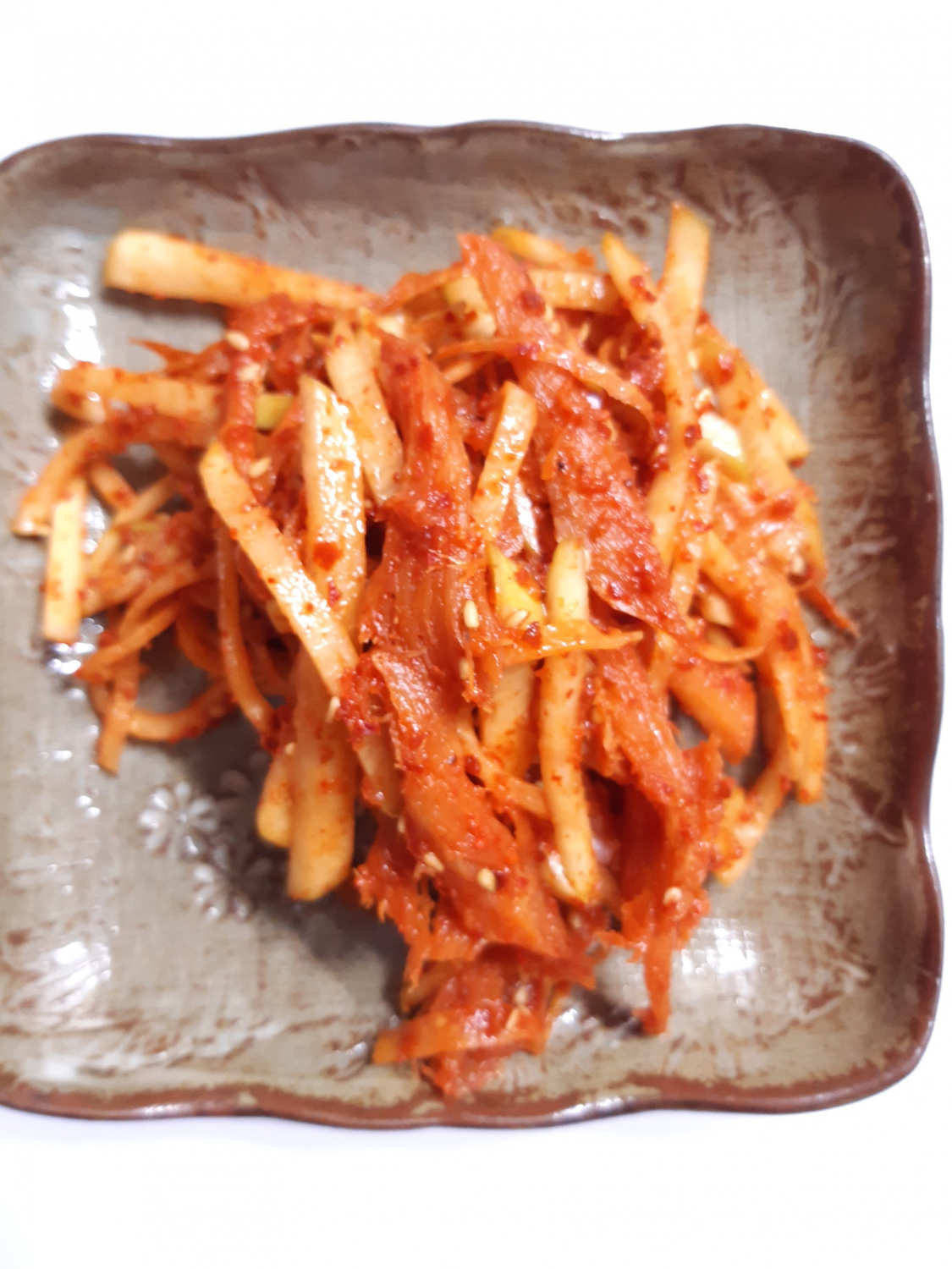 A truly delicious combination when chewy dried pollack meets crisp radish! This salad is also wonderful served with tofu. Waiting about 30 minutes after mixing allows the radish to soften slightly and the flavors to meld beautifully into both the radish and the pollack, enhancing its taste. The dried pollack absorbs excess moisture, so you won’t have to worry about a watery salad.