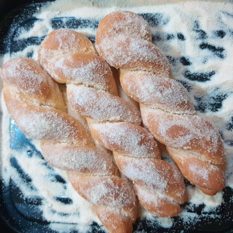 Now it’s time to shape the doughnuts! Take one dough ball and gently roll or stretch it into a long rope. Hold one end and twist it around itself, then gently pull the ends apart to create the classic twisted shape. Be careful not to pull too hard, or the dough might tear.