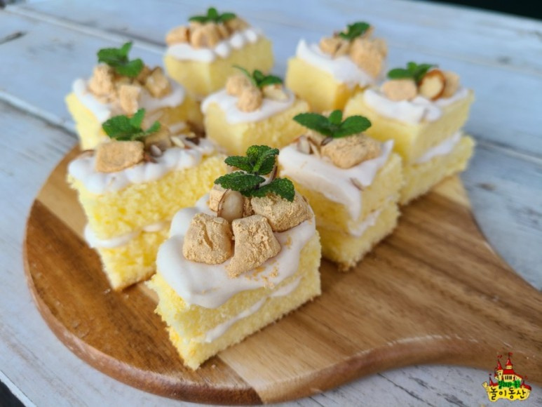 A delightful fusion of nutty soybean powder, chewy injeolmi (Korean rice cake), and soft castella cake! This bite-sized Injeolmi Cake is an ideal finger food dessert for home parties or special occasions, offering a unique twist that’s wonderfully satisfying. It’s incredibly easy to make, making it a perfect treat for everyone.