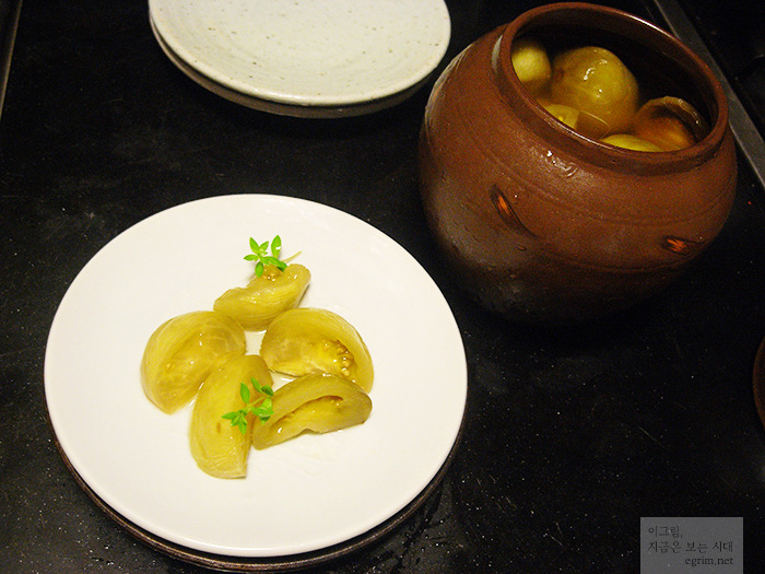 Here’s a look at the tomato jangajji after about a month of maturing. It has turned a lovely light yellow, reminiscent of ginkgo leaves.